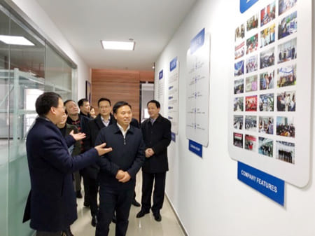 邢書記在企業(yè)文化墻駐足,了解企業(yè)發(fā)展史及園區(qū)招商引資過程,公司領導向邢書記介紹,從園區(qū)領導登門拜訪到項目簽約、裝修開工、完工搬遷、企業(yè)入駐,只用了不到一年的時間。