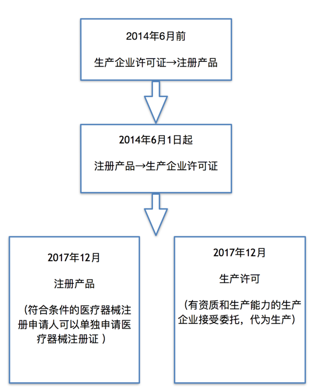 也就是說,原先可以一次性拿到生產(chǎn)企業(yè)許可證再申請(qǐng)產(chǎn)品注冊(cè)的模式,在2014年之后需要以產(chǎn)品為單位,依次取得注冊(cè)和許可兩次證明,這樣做雖然可以讓科研創(chuàng)新企業(yè)不必將前期資源消耗在生產(chǎn)廠房的投資上,但對(duì)專業(yè)從事于器械生產(chǎn)的企業(yè)來說要求更加嚴(yán)格了。